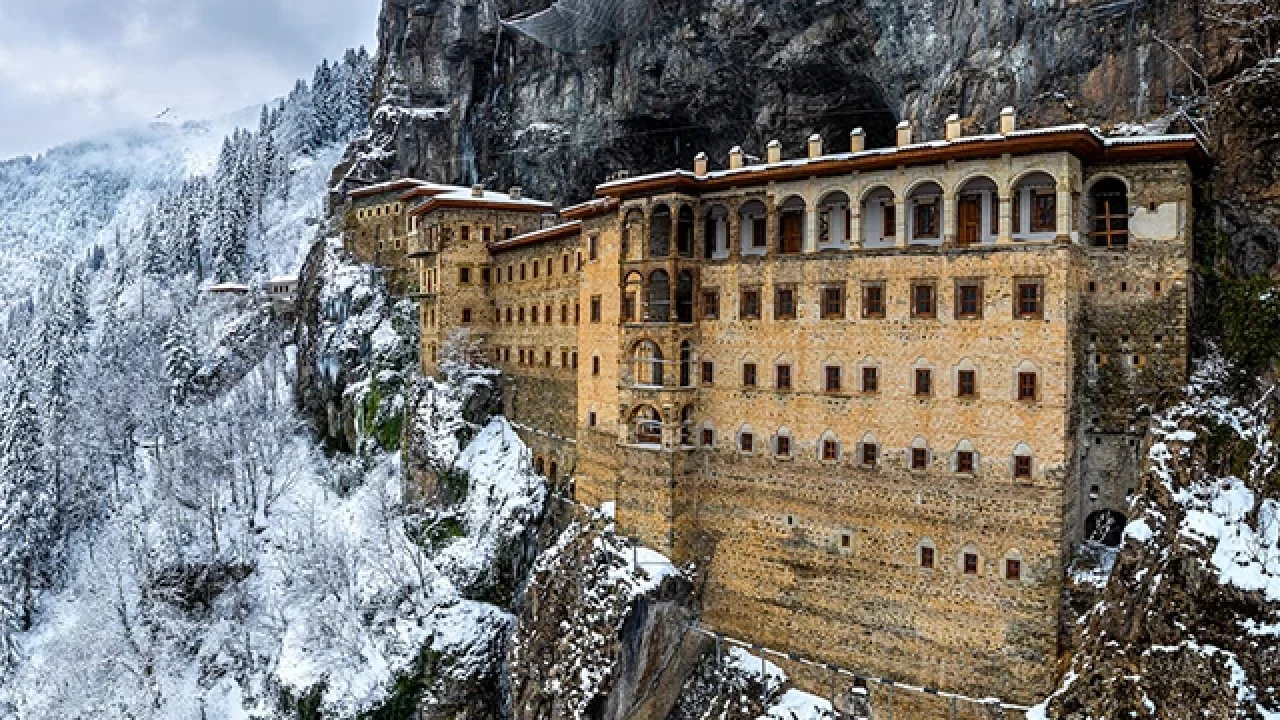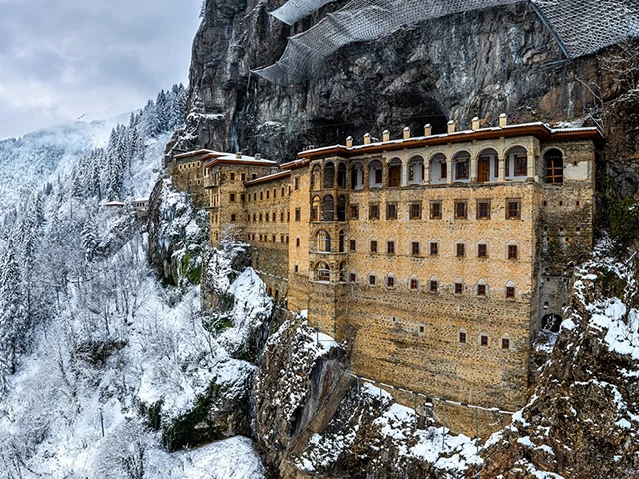 Trabzon'un Maçka ilçesindeki Altındere Vadisi Milli Parkı sınırları içerisinde yer alan Sümela Manastırı ve çevresi, kar yağışının ardından beyaza büründü.