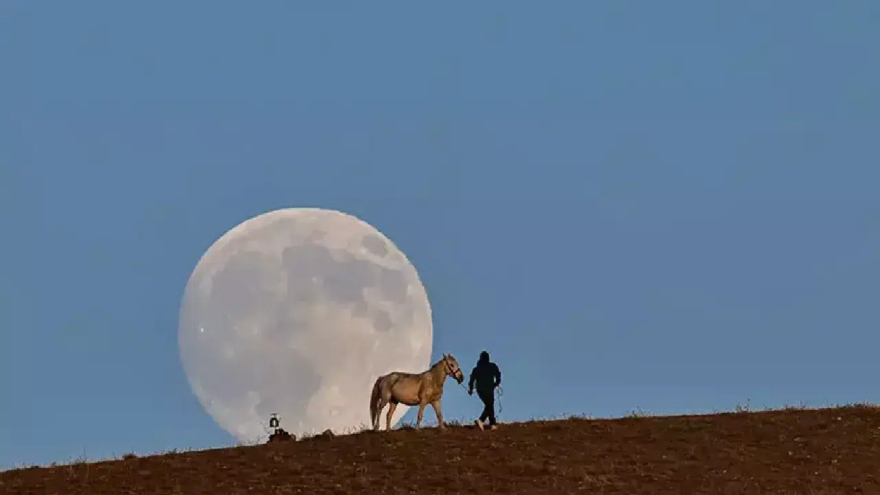 Kırsal bölgede atıyla birlikte tepeye çıkan bir vatandaşın dolunay silüetiyle birleşen görüntüsü, kartpostallık manzaralar ortaya çıkardı. Dolunayın büyüleyici ışığı altında oluşan bu kare, izleyenleri mest etti.