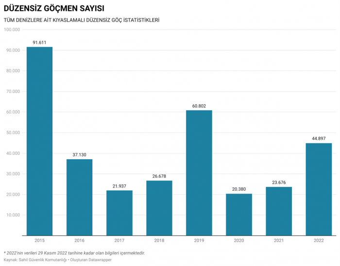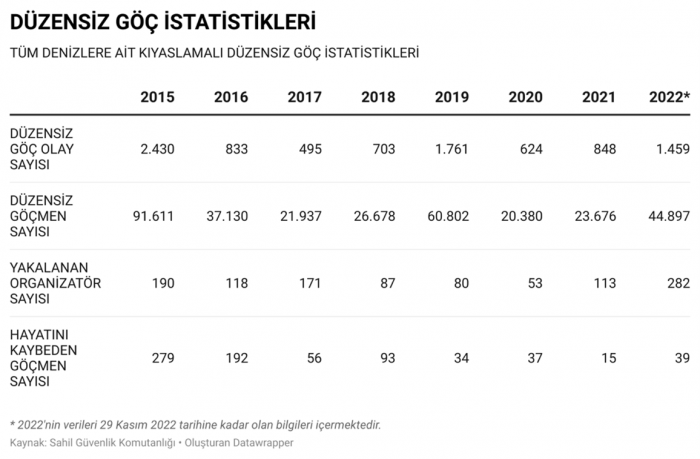 Sahil Güvenlik Komutanlığı’nın yayınladığı tüm denizlere ait düzensiz göç istatistiklerinde en yüksek oran Aylan bebeğin de hayatını kaybettiği 2015 yılında kaydedildi. 91 bin 611 düzensiz göçmen sayısının istatistiklere yansıdığı 2015’te hayatını kaybeden göçmen sayısı ise 279. Hayatını kaybeden göçmen sayısının en yoğun olduğu yıl 2016 iken, kurtarılan düzensiz göçmen sayısının en yoğun olduğu ikinci veri 2019’da gerçekleşti. Yakalanan organizatör sayısı en fazla 282 kişiyle 2022 yılında oldu.