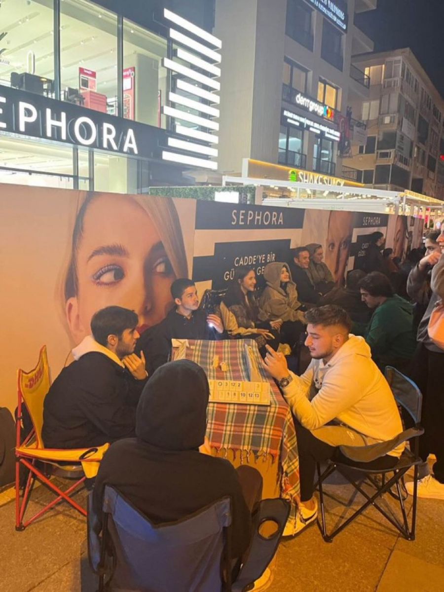Beraberinde portatif sandalye, katlanabilir masa, oyun takımları, çay ile atıştırmalıklar ve test kitapları ile gelen yüzlerce kişi kozmetik mağazasının açılışını bekliyor.