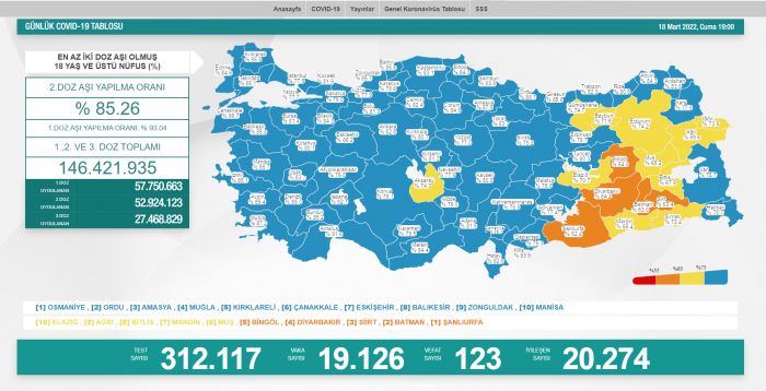 18 yaş üstünde en az iki doz aşı yaptıranların oranının en yüksek olduğu 10 il Osmaniye, Ordu, Amasya, Muğla, Kırklareli, Çanakkale, Eskişehir, Balıkesir, Zonguldak ve Manisa oldu.