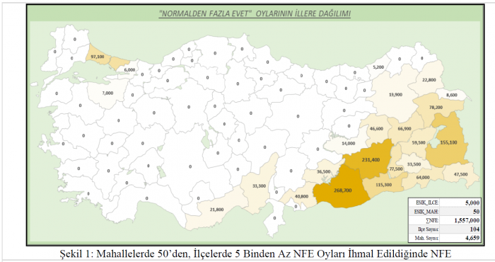 “Bu bilgilere göre Anayasa'da kökten değişiklik yapan Referandumun EVET olarak sonuçlanmasında 2 milyonu aşkın NFE (Normalden Fazla Evet) oyu vardır. Referandumda, Türkiye içindeki farkın 1 milyon 123 binden az olduğu dikkate alındığında 2 milyon sayısının önemi daha da belirginleşir. Sadece 104 ilçenin 4,659 mahallesindeki NFE oy sayısı 1 milyon 557 bin'den fazladır. Daha da ilginç olan NFE oylarının büyük çoğunluğunun, coğrafi olarak belirli bir bölgede toplanmış olmasıdır. Yapılacak ilk Cumhurbaşkanlığı Seçiminde bu 104 ilçede, benzer anormalliğin daha etkili olarak ortaya çıkacağını düşünürsek hatta yapmış olur muyuz?