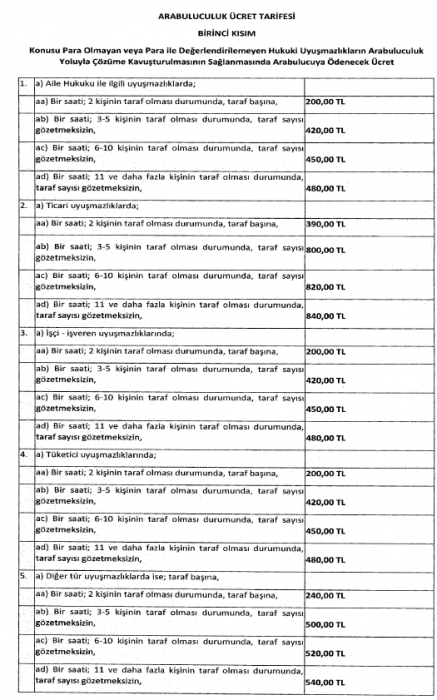 Tarifeye göre, aile hukuku, işçi-işveren ve tüketici uyuşmazlıklarında arabulucuya, 2 kişinin taraf olması durumunda taraf başına bir saati 200 lira, 3-5 kişinin taraf olması durumunda taraf sayısı gözetmeksizin bir saati 420 lira, 6-10 kişinin taraf olması durumunda taraf gözetmeksizin bir saati 450 lira, 11 ve daha fazla kişinin taraf olması durumunda taraf sayısı gözetmeksizin bir saat için 480 lira ödenecek.