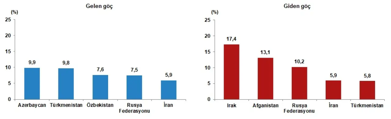 Türkiye’ye gelen yabancı uyruklu nüfus içinde en büyük grubu yüzde 9,9 ile Azerbaycan vatandaşları oluşturdu. Onları Türkmenistan (yüzde 9,8), Özbekistan (yüzde 7,6), Rusya Federasyonu (yüzde 7,5) ve İran (yüzde 5,9) vatandaşları takip etti.