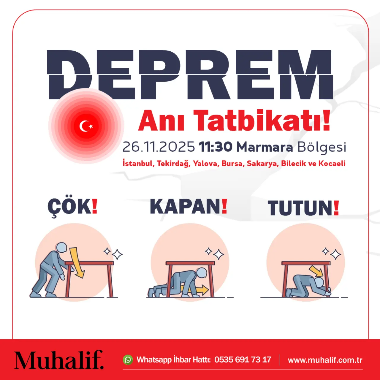 AFAD, olası Marmara depremine hazırlık çerçevesinde Türkiye Afet Müdahale Planı (TAMP) çerçevesinde ulusal deprem tatbikatı düzenliyor. 26 Kasım 2025 Çarşamba günü 7 ilde eş zamanlı deprem tatbikatı yapılacak. Tatbikat; İstanbul, Tekirdağ, Yalova, Bursa, Sakarya, Bilecik ve Kocaeli illerini kapsayacak.