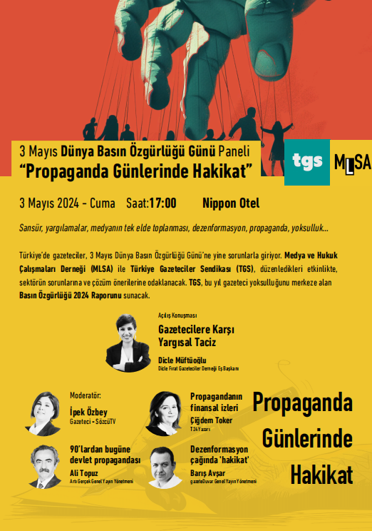 Medya ve Hukuk Çalışmaları Derneği (MLSA) ile Türkiye Gazeteciler Sendikası (TGS), düzenledikleri etkinlikte, sektörün sorunlarına ve çözüm önerilerine odaklanacak. TGS’nin bu yıl gazeteci yoksulluğunu merkeze alan Basın Özgürlüğü 2024 Raporunun lansmanının yanısıra MLSA’nın Sansür ve RTÜK Rapor bulguları paylaşılacak. Tam bir yıl evvel, tekrar bir 3 Mayıs Dünya Basın Özgürlüğü Günü’nde tutuklanan, Dicle Fırat Gazeteciler Derneği Eş Başkanı Dicle Müftüoğlu, Yargısal Taciz üzerine konuşacak.
