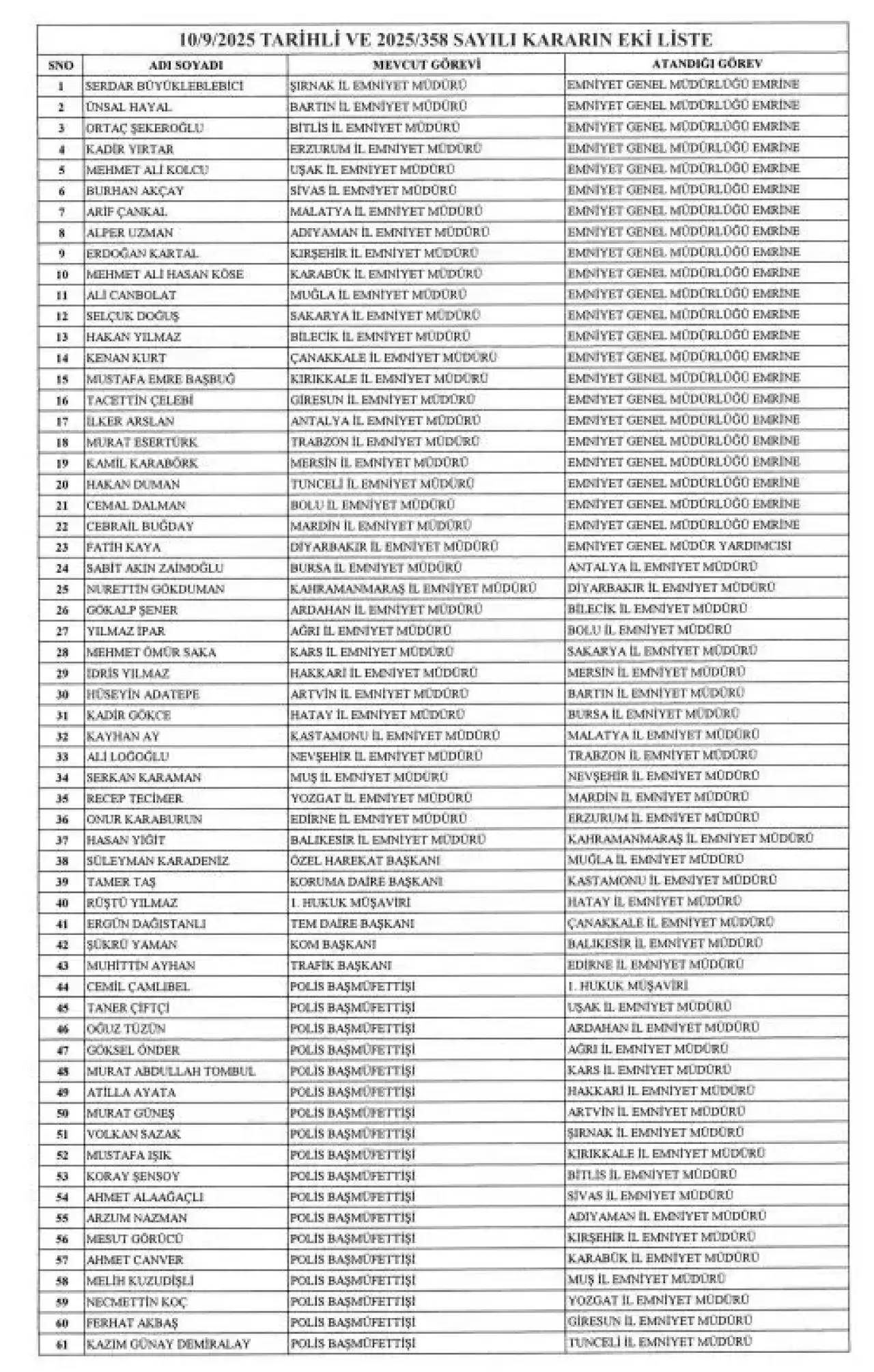 Kararnamede Özel Harekat Başkanı Süleyman Karadeniz, Muğla İl Emniyet Müdürü olarak atanırken, TEM Daire Başkanı Ergün Dağıstanlı Çanakkale İl Emniyet Müdürlüğü görevine getirildi. Ayrıca Emniyet Koruma Daire Başkanı Tamer Taş Kastamonu, KOM Başkanı Şükrü Yaman Balıkesir ve Trafik Başkanı Muhittin Ayhan Edirne İl Emniyet Müdürü olarak görevlendirildi.