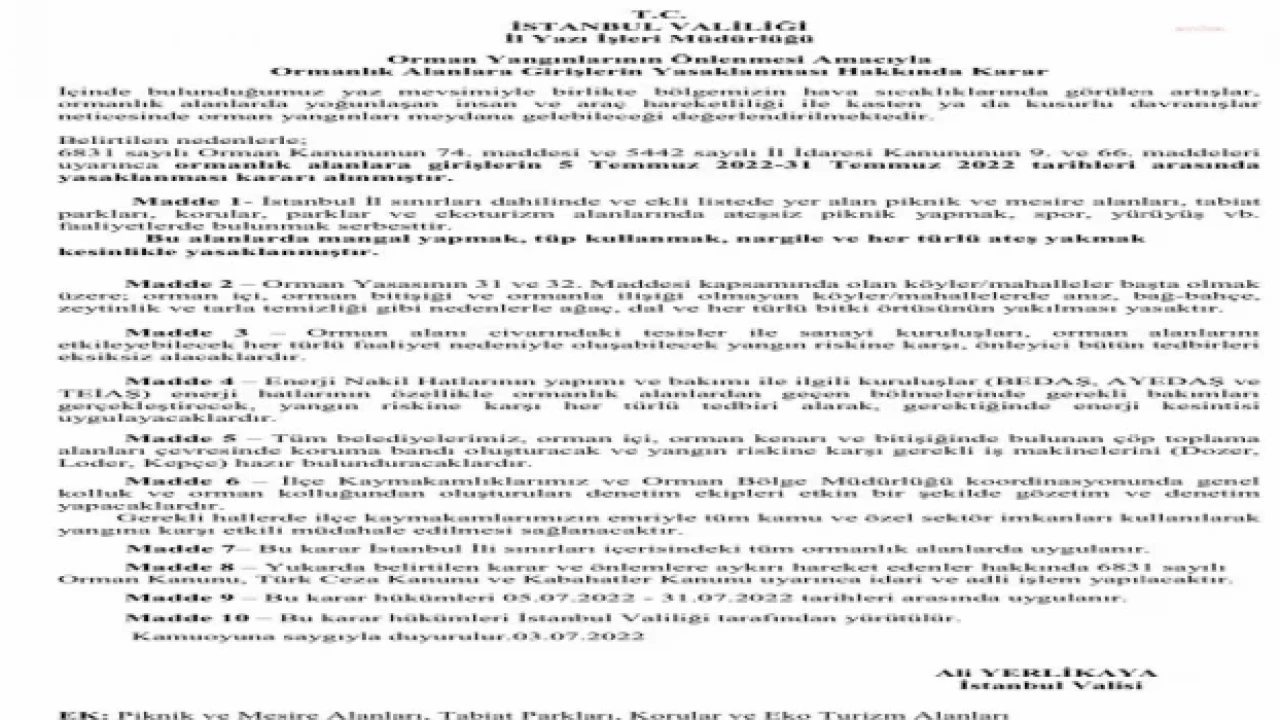 İstanbul Valiliği, “Ormanlık alanlara girişlerin 5 Temmuz 2022-31 Temmuz 2022 tarihleri arasında yasaklanması kararı alınmıştır” açıklamasını yaptı.