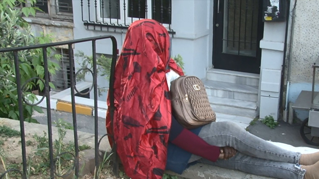 Beyoğlu ilçesi Ömer Hayyam Mahallesi'ndeki bir istinat duvarının üzerine 5 gün önce oturan 30'lu yaşlardaki Afrikalı bir kadın, gece gündüz kalkmadan duvar üstünde oturuyor. Yüzünde cerrahi maske bulunan kadın üzerini ve yüzünü ise berber önlüğüyle örtüyor.