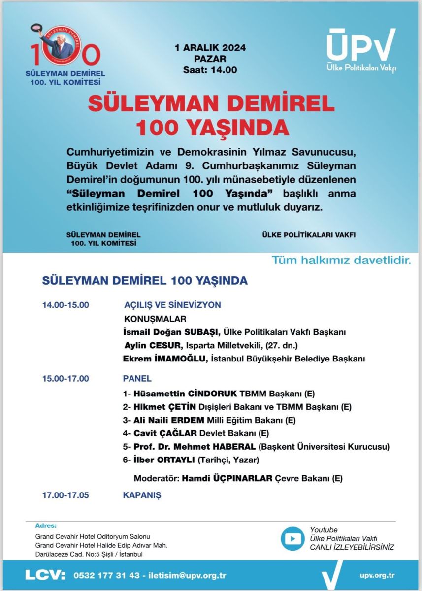 Süleyman Demirel doğumunun 100. Yılında İstanbul’da anılıyor. ’Süleyman Demirel 100 yaşında’ başlıklı anma etkinliğine Siyasetin tanınmış yüzleri katılacak.