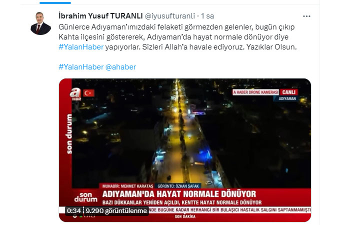 Kahramanmaraş merkezli 7.7 ve 7.6 büyüklüğündeki depremlerde yıkılan 11 ilden biri olan Adıyaman’da  felaketin izleri henüz silinmiş değil. A Haber deprem felaketinin vurduğu Adıyaman’da hayatın normale döndüğünü iddia ederek haber yayınladı. A Haber’in yayınladığı görüntülerde Kahta ilçesinin görsellerinin kullanılması büyük tepki çekti. Kahta Belediye Başkanı İbrahim Yusuf Turanlı yaptığı paylaşımla A Haber’e tepki gösterdi.