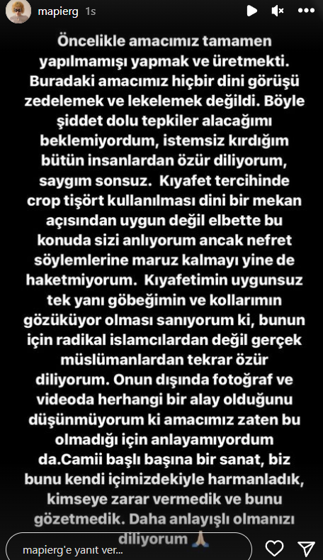 İnstagram hesabından yaptığı açıklamada, "Kocatepe Camii'nde yapmış olduğum çalışmanın amacından çok fazla saptığı ve yanlış yerlere çekildiğini üzülerek izlemekteyim. Niyetimin camiye küsmüş belli bir kesimin önyargısını kırıp huzuru bulacakları yerin camii olduğunu göstermekken şu an vatan hainliğine kadar ilerleyen yakıştırmalar görmek beni ve ailemi endişelendiriyor. Keşke böyle olmasaydı. Kırdığım, yanlış anlaşıldığım herkesten ayrı ayrı özür dilerim." ifadelerini kullandı.