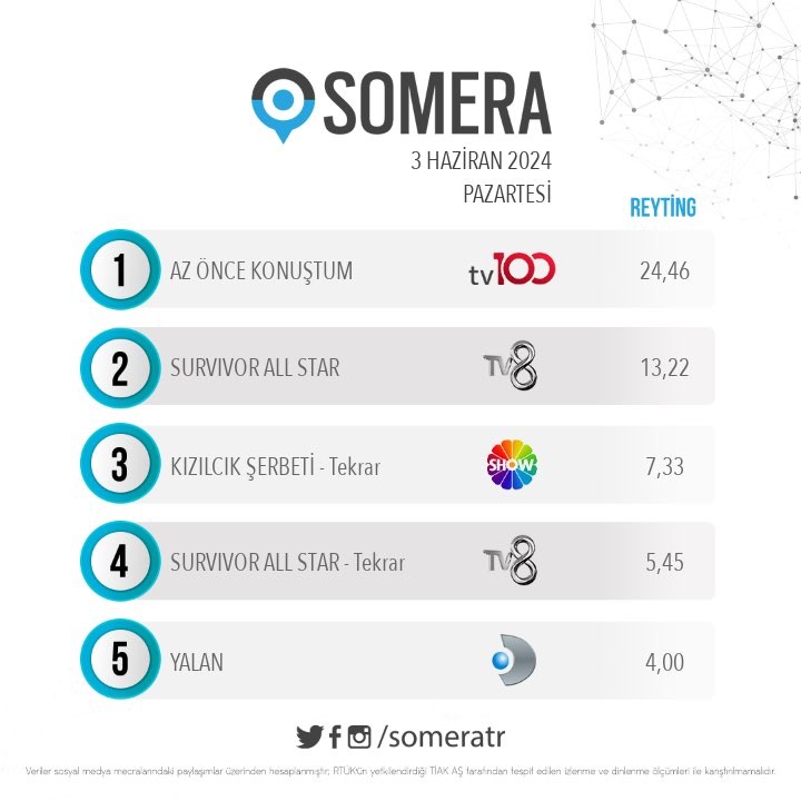 "Bu listeye girebilirsiniz ki biz hep giriyoruz ama bugün Türkiye'deki televizyon yayıncılığında şunu başarmak için ya dizi çekmeniz ya naklen maç yayınlamamız ya da AZ ÖNCE KONUŞTUM yapmanız gerekir😎 Dün akşam bizi seyreden herkese ve tüm ekip arkadaşlarıma teşekkürlerimle... "
