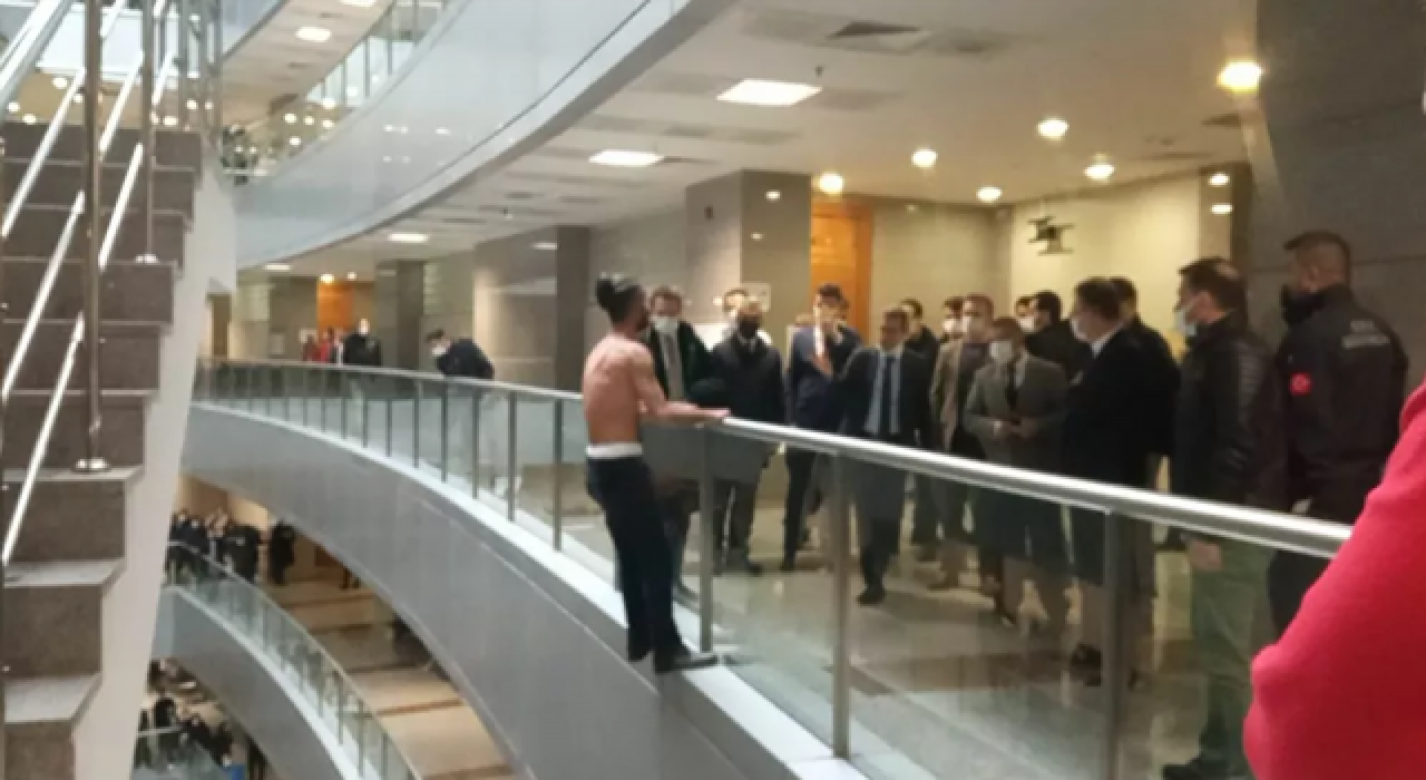 Çağlayan'da bulunan İstanbul Adalet Sarayı'nın 4. kat korkuluklarına çıkan bir kişi intihar girişiminde bulunuyor.