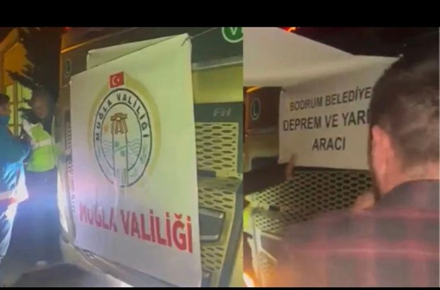 Bodrum Belediyesi  tarafından deprem bölgesine gönderilen yardım TIR’ına, Muğla Valiliğinin kendi pankartını astığı fotoğraflar CHP milletvekili Aylin Nazlıaka tarafından dün paylaşılmış, Bodrum Belediye Başkanı Ahmet Aras ise “şimdi bunlarla uğraşamayız” diyerek tepki göstermeye gerek duymamıştı.