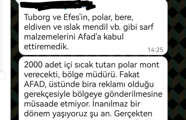 “Az evvel Adana'da  yardım çadırında yemek dağıtımında görev yapan kuzenim (eşi görevli) ile görüştüm. Kendisi belediye halk eğitimde görevli eğitmenlik yaptığı için belediyenin kurduğu yemek dağıtımda görevli.