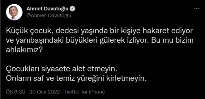 Gelecek Partisi Genel Başkanı Ahmet Davutoğlu, yaşanan bu olaya Twitter hesabından tepki gösterdi. Ahmet Davutoğlu, "Çocukları siyasete alet etmeyin. Onların saf ve temiz yüreğini kirletmeyin." dedi. Davutoğlu'nun paylaşımı şöyle: