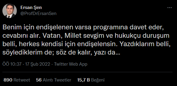 Ersan Şen, "Benim için endişelenen varsa programına davet eder, cevabını alır. Vatan, Millet sevgim ve hukukçu duruşum belli, herkes kendisi için endişelensin. Yazdıklarım belli, söylediklerim de; söz de kalır, yazı da…" diye belirtti.