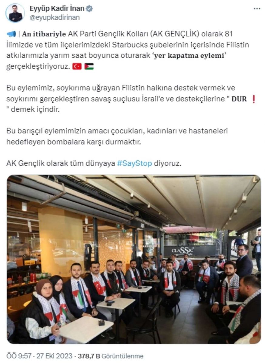 "AK Parti Gençlik Kolları (AK Gençlik) olarak 81 İlimizde ve tüm ilçelerimizdeki Starbucks şubelerinin içerisinde Filistin atkılarımızla yarım saat boyunca oturarak "yer kapatma eylemi" gerçekleştiriyoruz.
