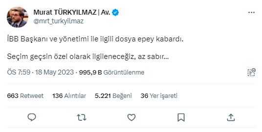 Türkyılmaz yaptığı paylaşımda İBB Başkanı Ekrem İmamoğlu’na, ”İBB Başkanı ve yönetimi ile ilişkin dosya epey kabardı. Seçim geçsin özel olarak ilgileneceğiz, az sabır…” dedi.