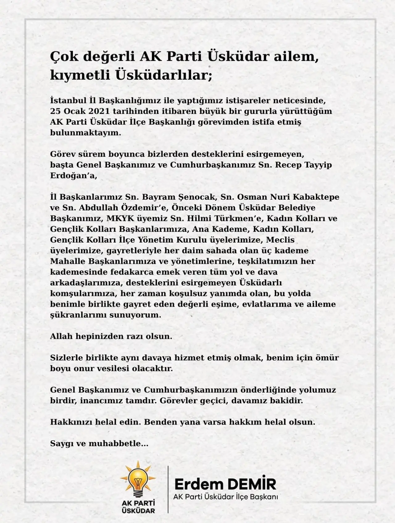 İstanbul İl Başkanlığımız ile yaptığımız istişareler neticesinde, 25 Ocak 2021 tarihinden itibaren büyük bir gururla yürüttüğüm AK Parti Üsküdar İlçe Başkanlığı görevimden istifa etmiş bulunmaktayım.