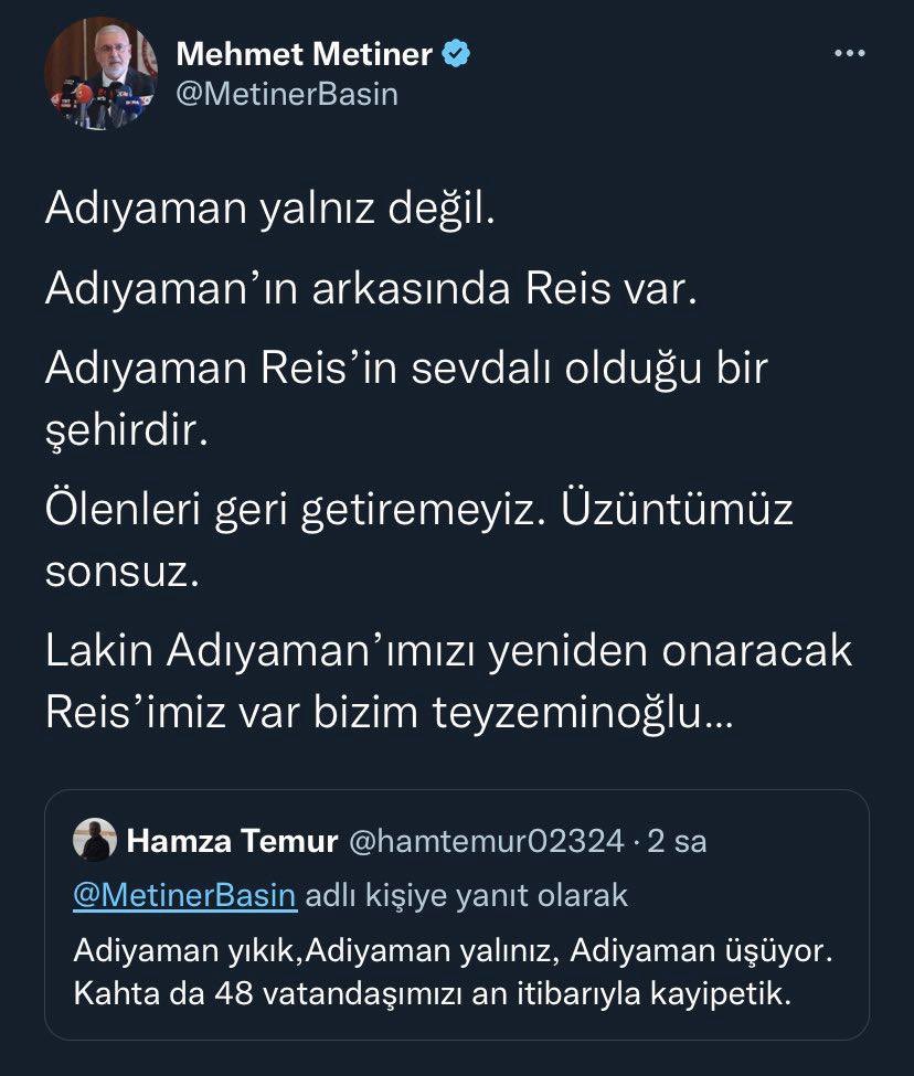 Metiner’in gönderisine Hamza Temur isimli bir kullanıcı, ”Adıyaman yıkık, Adıyaman yalınız, Adıyaman üşüyor. Kahta’da 48 vatandaşımızı an itibarıyla kaybettik” diye yazdı.
