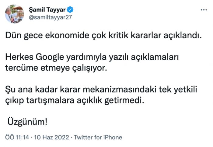 Tayyar Twitter hesabından yaptığı paylaşımda, "Dün gece ekonomide çok kritik kararlar açıklandı. Herkes Google yardımıyla yazılı açıklamaları tercüme etmeye çalışıyor. Şu ana kadar karar mekanizmasındaki tek yetkili çıkıp tartışmalara açıklık getirmedi. Üzgünüm!" ifadesini kullandı.