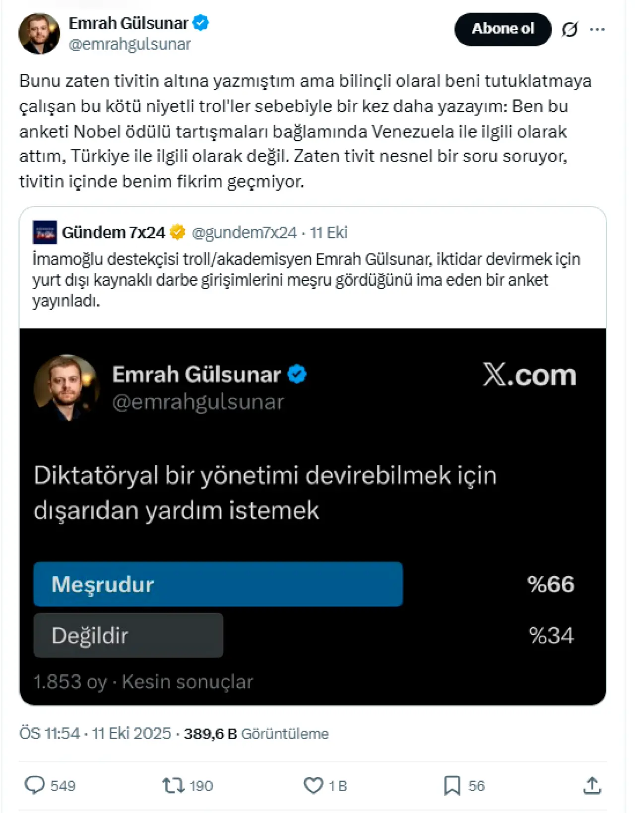 "Bunu zaten tivitin altına yazmıştım ama bilinçli olaral beni tutuklatmaya çalışan bu kötü niyetli trol'ler sebebiyle bir kez daha yazayım: Ben bu anketi Nobel ödülü tartışmaları bağlamında Venezuela ile ilgili olarak attım, Türkiye ile ilgili olarak değil. Zaten tivit nesnel bir soru soruyor, tivitin içinde benim fikrim geçmiyor."
