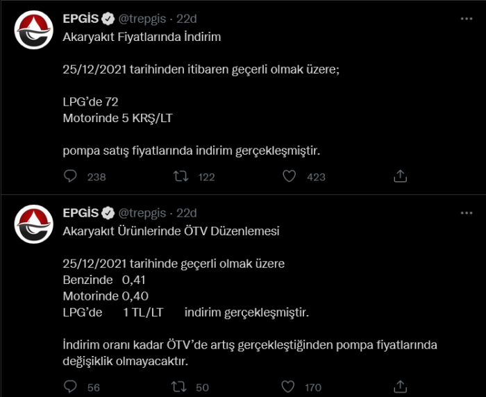 EPGİS, söz konusu indirimlerin ÖTV'ye yansıyacağını açıkladıktan sonra LPG'ye 72 kuruş ve Motorine 5 kuruş indirim geldiğini ve bu indirimlerin pompa satış fiyatlarına yansıyacağını belirtti.