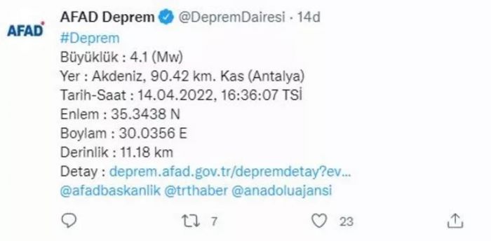 AFAD'dan son dakika deprem haberi geldi. AFAD, Kaş açıklarında 4.1 büyüklüğünde bir deprem meydana geldiğini duyurdu.