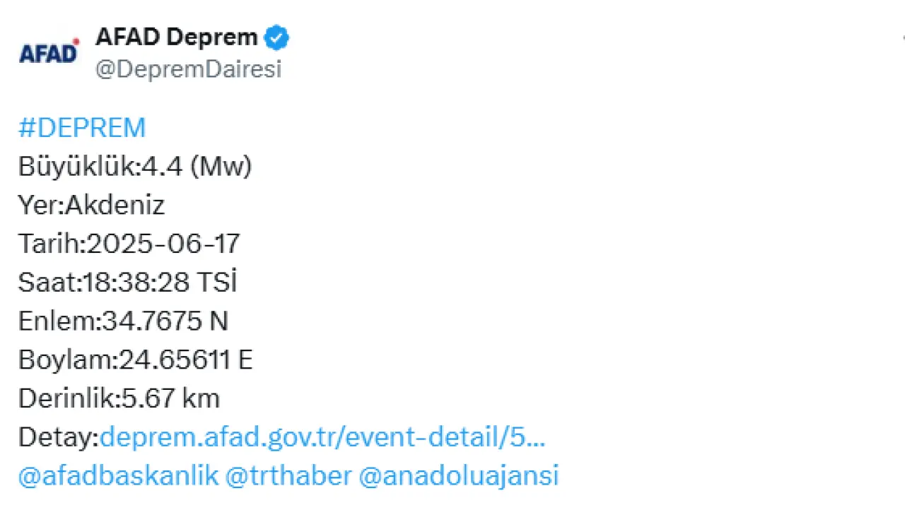 AFAD, Akdeniz'de 4.4 büyüklüğünde deprem meydana geldiğini duyurdu.