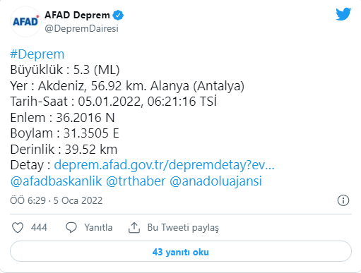 Afet ve Acil Durum Yönetimi Başkanlığının (AFAD) internet sitesinde yer alan bilgiye göre, saat 06.21'de Akdeniz'de, Antalya'nın Alanya ilçesi açıklarında 5,3 büyüklüğünde deprem kaydedildi.
