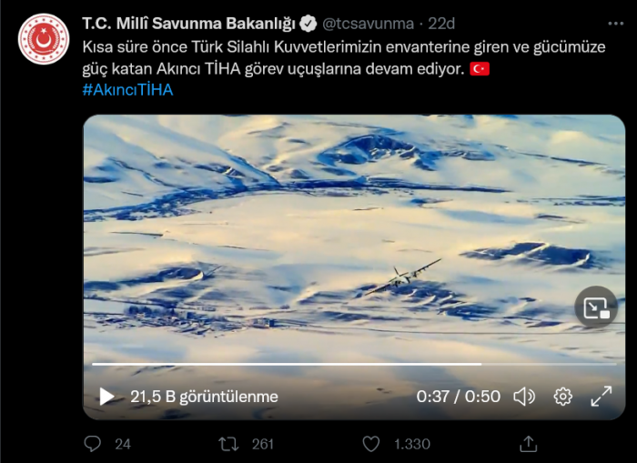 Akıncı TİHA'nın görev uçuşlarına devam ettiğini bildiren Milli Savunma Bakanlığı Twitter hesabından paylaştığı videoyu şu notu ekledi: