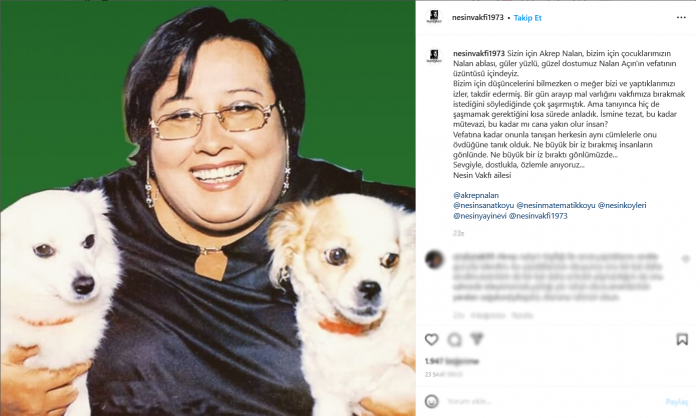 Akrep Nalan'ın hayatını kaybetmesinin ardından Nesin Vakfı tarafından bir mesaj yayınlandı. 67 yaşında hayata veda eden sanatçının mirasını Nesin Vakfı'na bağışladığı açıklandı.