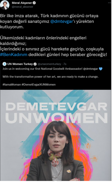 İYİ Parti Genel Başkanı Meral Akşener, Twitter hesabından İyi Niyet Elçisi görevine layık görülen Demet Evgar'ı tebrik etti. Akşener, Türkiye'deki kadınların önündeki engelleri kaldırıldığı zaman "Ben Kadınım dedikleri günleri hep beraber göreceğiz" diyerek şu paylaşımı yaptı: