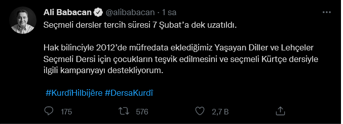 Hak bilinciyle 2012’de müfredata eklediğimiz Yaşayan Diller ve Lehçeler Seçmeli Dersi için çocukların teşvik edilmesini ve seçmeli Kürtçe dersiyle ilgili kampanyayı destekliyorum.
