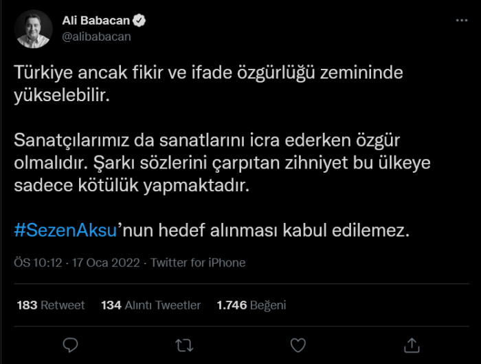 Demokrasi ve Atılım (DEVA) Partisi Genel Başkanı Ali Babacan, Sezen Aksu'ya Twitter'dan yaptığı paylaşım ile destek verdi.  Babacan'ın paylaşımı şöyle: