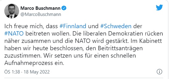 Almanya Adalet Bakanı Marco Buschmann, Twitter hesabından yaptığı açıklamada, "Finlandiya ve İsveç'in NATO'ya katılmak istemesinden memnunuz. Liberal demokrasiler birbirine yaklaşıyor ve NATO güçleniyor. Kabinede bugün üyelik başvurularını onaylamaya karar verdik" ifadelerini kullandı.