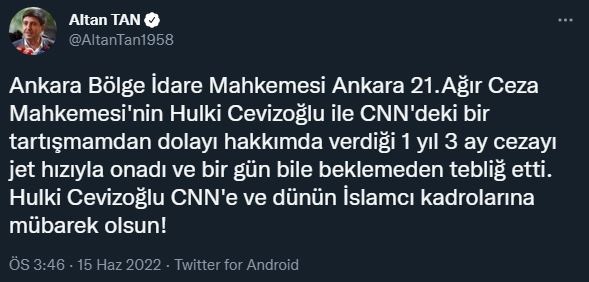 "Ankara Bölge İdare Mahkemesi Ankara 21.Ağır Ceza Mahkemesi'nin Hulki Cevizoğlu ile CNN'deki bir tartışmamdan dolayı hakkımda verdiği 1 yıl 3 ay cezayı jet hızıyla onadı ve bir gün bile beklemeden tebliğ etti. Hulki Cevizoğlu CNN'e ve dünün İslamcı kadrolarına mübarek olsun!"