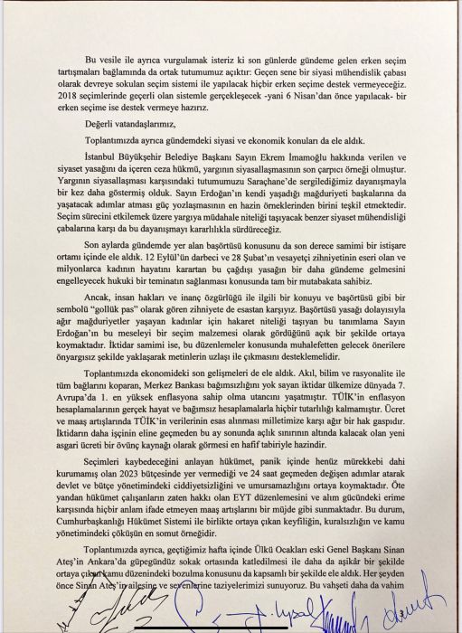 Bu yılın ilk toplantısı ile Altılı Masa olarak başlattığımız iş birliği sürecinin ilk yılını da tamamlamış olduk. Bu bağlamda toplantımıza bir yılın genel değerlendirmesi ile başladık. Üstlendiğimiz tarihi sorumluluğumuzun bilincinde olarak iş birliğimizi 12 Şubat 2022'deki ilk zirvemizde kamuoyuna duyurduğumuz ilke ve hedefler doğrultusunda sürdürme kararlılığımızı bir kez daha vurguluyoruz.