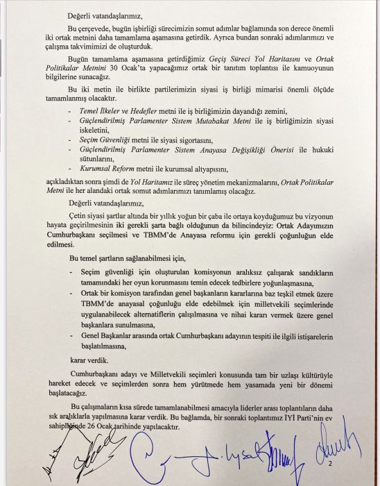 Bu çalışmaların kısa sürede tamamlanabilmesi amacıyla liderler arası toplantıların daha sık arajıklarla yapılmasına karar verdik. Bu bağlamda, bir sonraki toplantımız İYİ Parti'nin ev sahipl · de 26 Ocak  "hinde yapılacaktır.