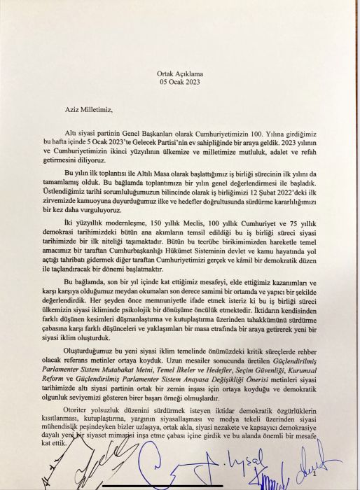 Altı siyasi partinin Genel Başkanları olarak Cumhuriyetimizin 100. Yılına girdiğimiz bu hafta içinde 5 Ocak 2023'te Gelecek Partisi'nin ev sahipliğinde bir araya geldik. 2023 yılının ve Cumhuriyetimizin ikinci yüzyılının ülkemize ve milletimize mutluluk, adalet ve refah getirmesini diliyoruz.