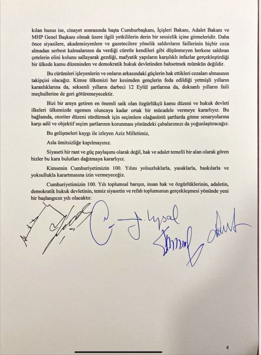 Bizi bir araya getiren en önemli saik olan özgürlükçü kamu düzeni ve hukuk devleti ilkeleri ülkemizde egemen oluncaya kadar ortak bir mücadele vermeye kararlıyız. Bu bağlamda, otoriter düzeni sürdürmek için seçimlere olağanüstü şartlarda gitme senaryolarına karşı adil ve objektif seçim şartlarının korunması yönündeki çabalarımızı da yoğunlaştıracağız.