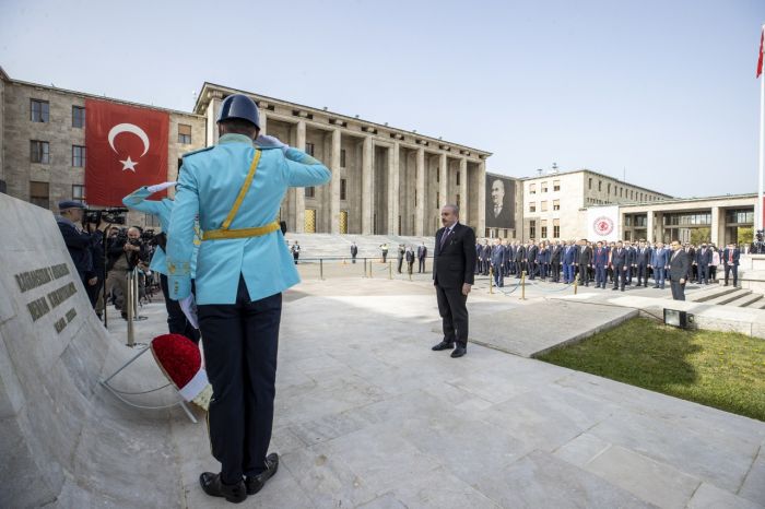 TBMM Başkanı Mustafa Şentop, TBMM Bahçesi'ndeki Atatürk heykeline çelenk koyarken önce saygı duruşu ardından da İstiklal Marşı okundu.