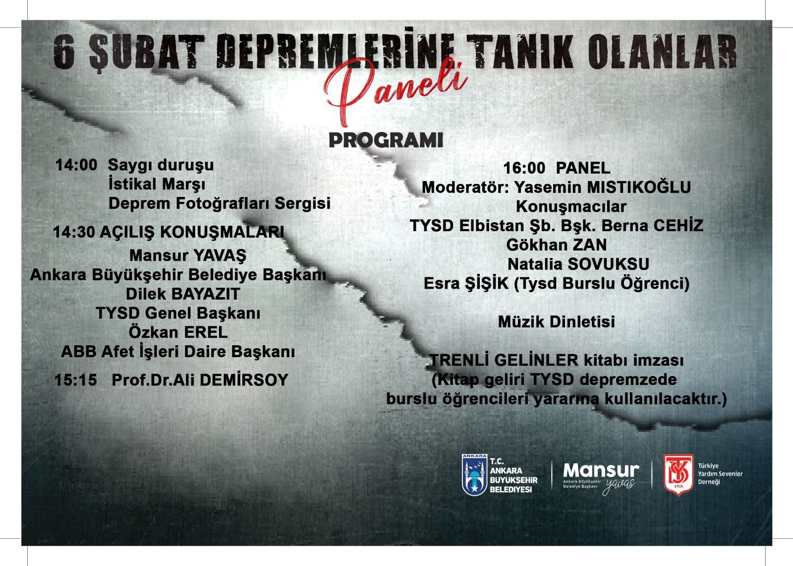 Bu matem günümüzün yıldönümüne günler kala gerçekleşecek etkinliğin açılış konuşmasını saat 14.30’da Ankara Büyükşehir Belediye Başkanı Mansur Yavaş yapacak. Ardından Türkiye Yardım Sevenler Derneği (TYSD) Genel Başkanı Dilek Bayazıt ve Ankara Büyükşehir Belediyesi Afet İşleri Daire Başkanı Özkan Erel söz alacak.