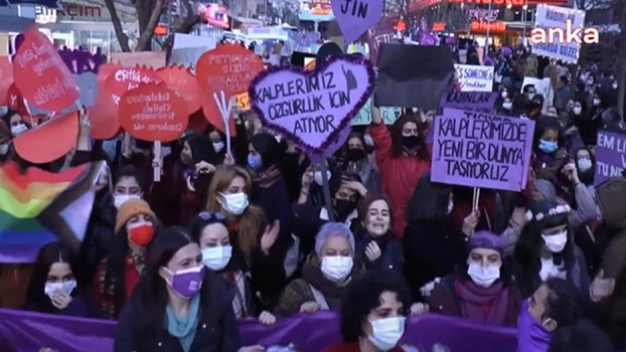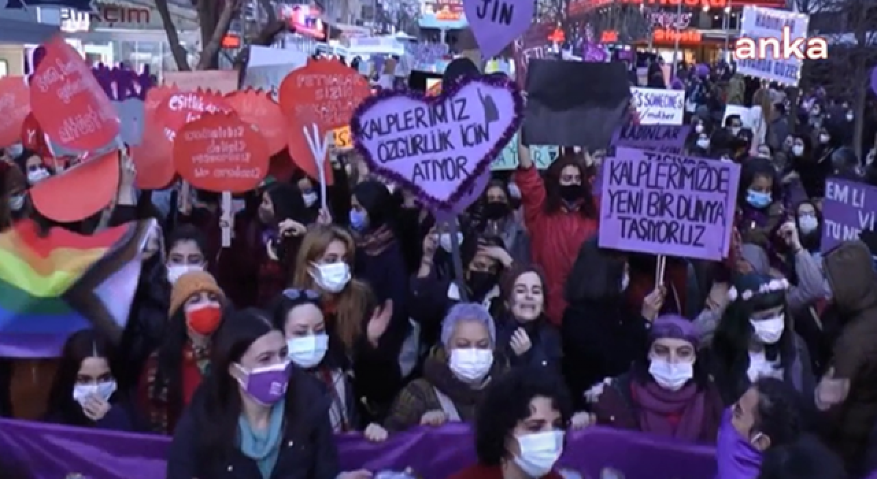 Kadınlar, 8 Mart Dünya Emekçi Kadınlar Günü dolayısıyla Ankara'da “Feminist Gece Yürüyüşü” düzenledi. Sakarya Caddesi’nde bir araya gelen kadınlar, “Kalplerimizde yeni bir dünya taşıyoruz" "6284 İstanbul Sözleşmesi yaşatır" " Erkek devlet şiddetine karşı öz savunmaya" "Evde kalmak hayatta kalmaya yetmiyor" yazılı pankartlar açarak meydan içerisinde yürüyüş yaptılar. "Yaşasın kadın dayanışması, yaşasın mücadelemiz" sloganları atan, halay çeken kadınlar, şiddete karşı yürüyüş yaptıklarını ifade ettiler.