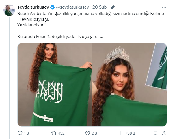 “Suudi Arabistan’ın güzellik yarışmasına yolladığı kızın sırtına sardığı Kelime-i Tevhid bayrağı.