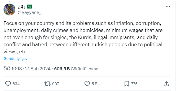 “Ülkenize ve ülkenizin problemlerine odaklanın; enflasyon, yolsuzluk, işsizlik, her gün işlenen suçlar ve cinayetler, bekarlara bile yetmeyen asgari ücretler, Kürtler, yasadışı göçmenler ve siyasi görüş farklılığı sebebiyle Türk halkının farklı kesimleri arasındaki günlük çatışmalar ve nefretler v.b.”