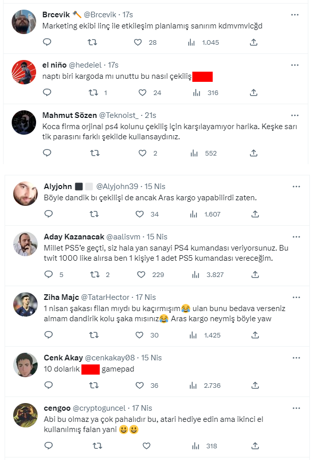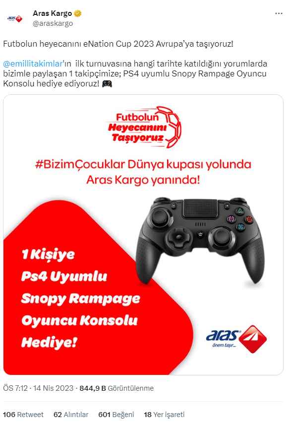 Bu çekilişler için Playstation gibi konsol ürünü ya da bir cep telefonu oldukça sıradan şeyler. Aras Kargo ise bırakın konsol cihazını ya da gamepad vermeyi orijinal markaya ait olmayan ikame bir ürünü çekilişe sundu.
