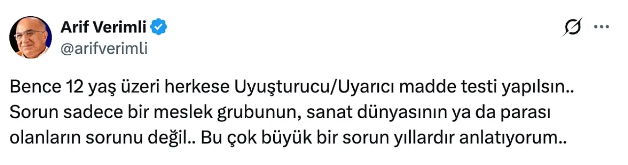 Verimli paylaşımında, “Bence 12 yaş üzeri herkese uyuşturucu/uyarıcı madde testi yapılsın. Sorun sadece bir meslek grubunun, sanat dünyasının ya da parası olanların sorunu değil. Bu çok büyük bir sorun, yıllardır anlatıyorum” ifadelerini kullandı.
